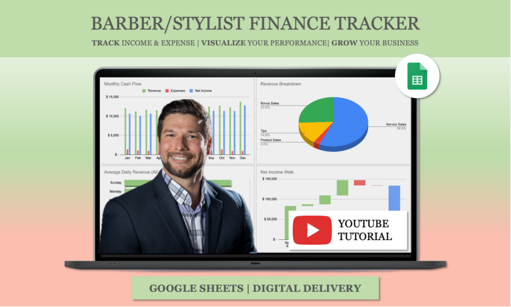 The Barber Financial Tracker Spreadsheet is a Google Sheet that was designed and built to help individual Barbers manage their business and reach their financial goals. The software was built to support using it over and over for many years to come.