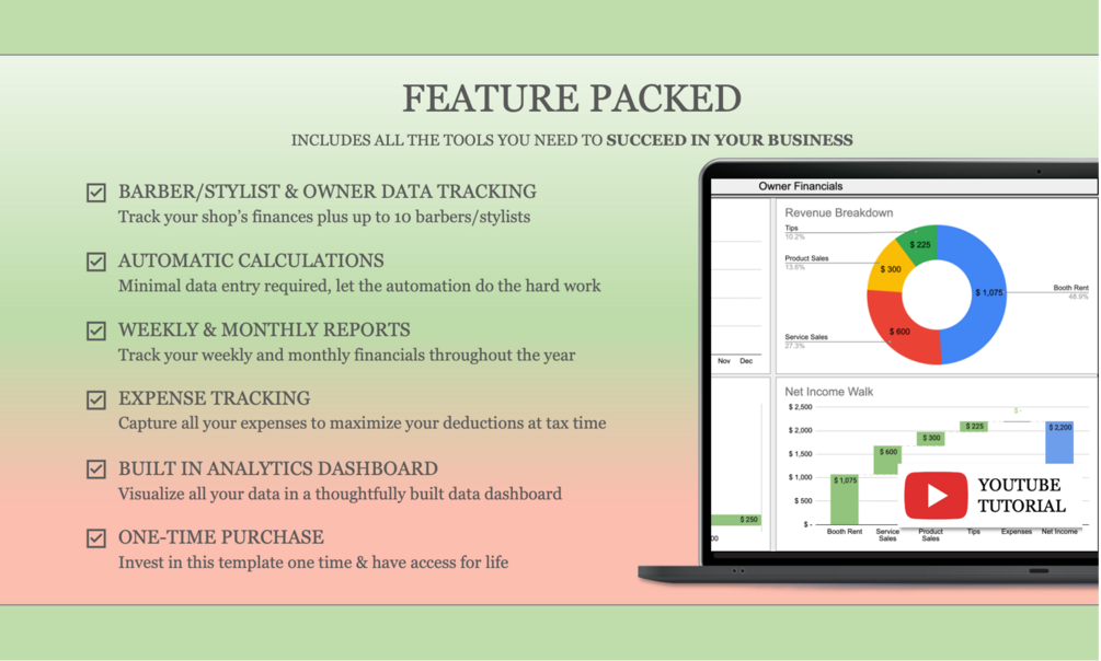 The Barbershop Financial Tracker Spreadsheet is a Google Sheet that was designed and built to help Barbershop Owners manage their business and reach their financial goals. The software was built to support using it over and over for many years to come.